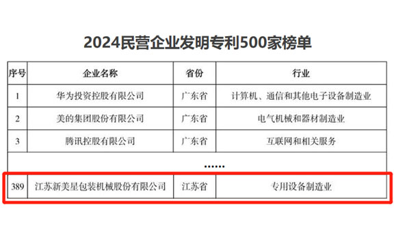 近日,2024年全國民營企業(yè)科技創(chuàng)新與標(biāo)準(zhǔn)創(chuàng)新大會(huì)在哈爾濱召開。會(huì)上,發(fā)布了2024研發(fā)投入前1000家民營企業(yè)創(chuàng)新狀況報(bào)告,以及一系列相關(guān)榮譽(yù)榜單、名單。新美星以卓有成效的發(fā)明專利成果順利入圍“2024民營企業(yè)發(fā)明專利500家”榜單。